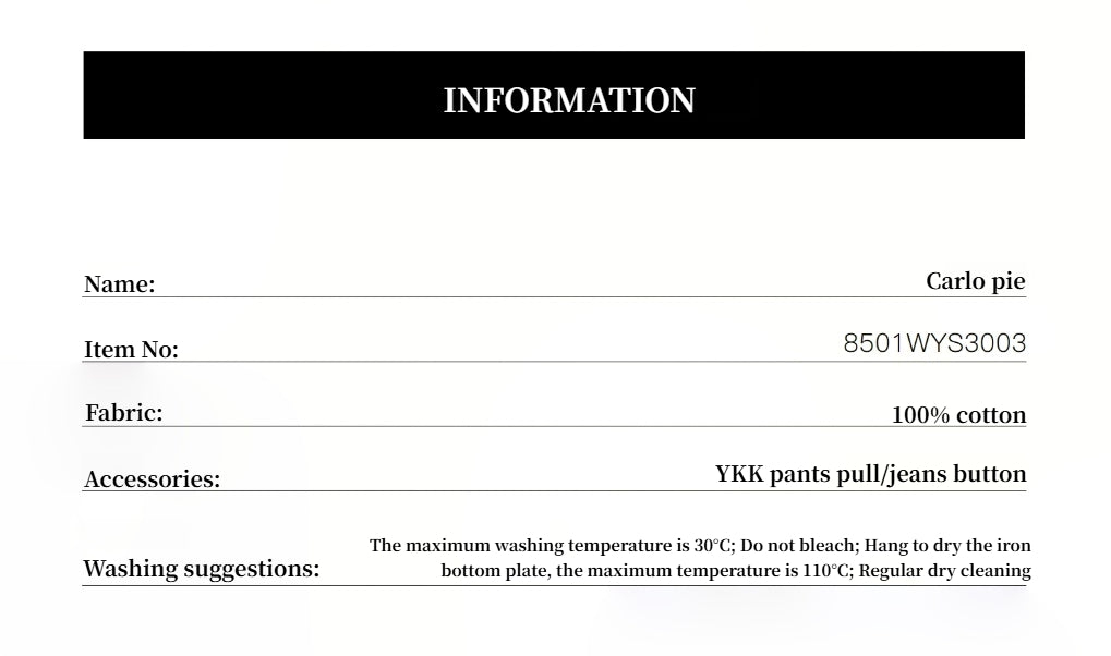 Selected high-quality cotton fibers, the fabric has a clear and three-dimensional texture, the texture is soft and skin-friendly, and the high-density weaving brings a soft and tough texture. The fabric is of moderate thickness, dry and comfortable, crisp and stylish. After heavy washing treatments such as environmentally friendly fermented stone washing, it creates a rich two-color texture, original calla lily pattern, laser positioning printing details, and precise color fixing technology to create clear color layers, retro and durable.